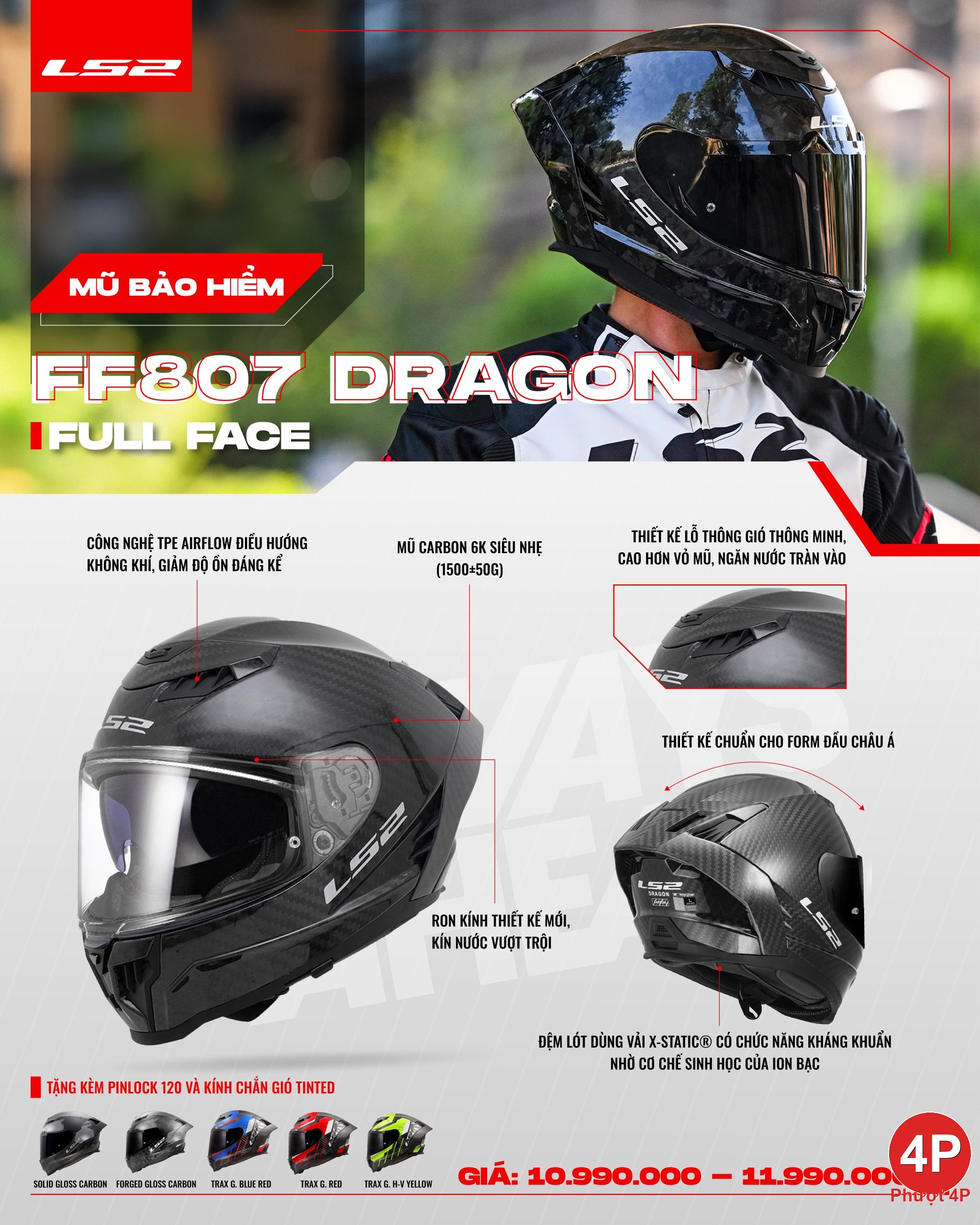 LS2 FF807 Dragon là mũ fullface carbon 6K mới, nâng cấp đáng giá cho hội mê xê dịch muốn “an toàn – thoải mái– đẳng cấp”. Đuôi gió carbon đồng bộ tôn dáng khí động học, TPE Airflow điều hướng gió giúp giảm ồn, cửa hút gió đặt cao hạn chế nước tràn, còn ron kính thế hệ mới tăng độ kín nước khi đi mưa.