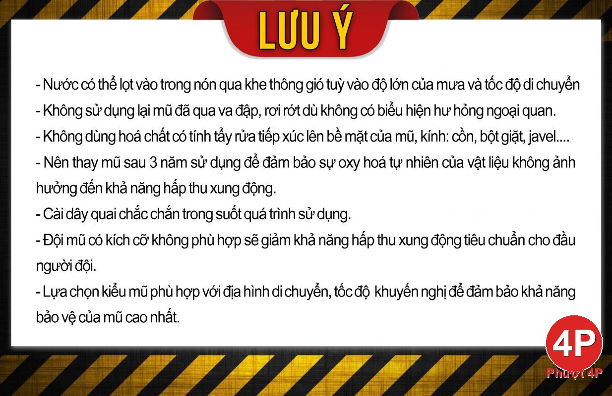 Để đảm bảo an toàn, người đội cần chọn mũ đúng kích cỡ và cài chặt quai, bên cạnh đó bạn còn cần chú ý đến thiết kế của form mũ và chất liệu vỏ mũ dưới các lực tác động. Điều quan trọng nhất khi lựa chọn là mũ phải thật sự vừa vặn với form đầu người đội, từ thiết kế vỏ mũ, hình dạng mút xốp EPS đều phải phù hợp với chu vi vòng đầu.