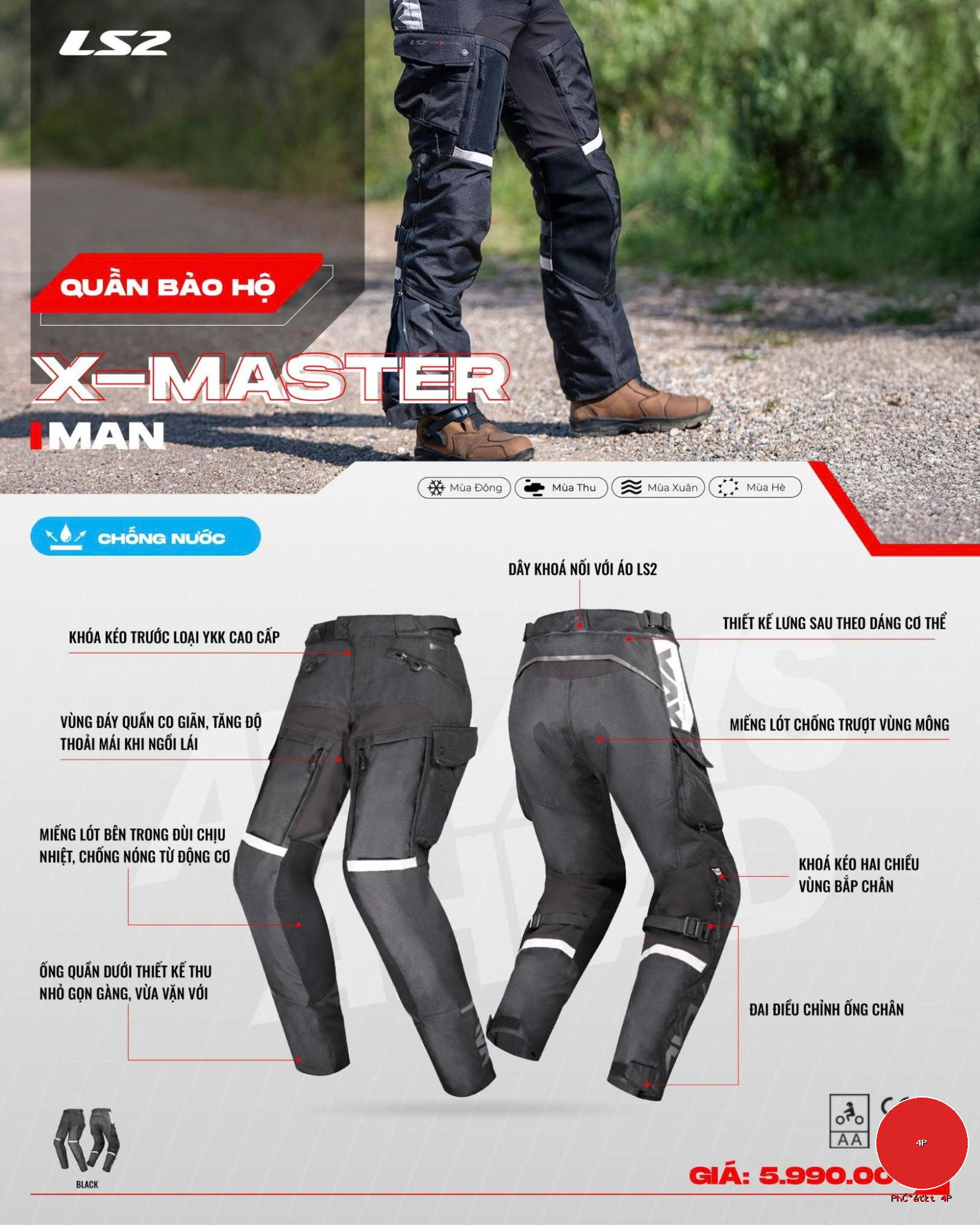 Quần bảo hộ LS2 X-MASTER là mẫu quần adventure/touring 3 lớp được thiết kế cho biker thường xuyên đi xa, đi tour dài ngày, chạy nhiều điều kiện thời tiết. Đây là lựa chọn lý tưởng để kết hợp cùng áo LS2 X-MASTER, tạo thành một bộ đồ bảo hộ đồng bộ về an toàn chống nước, thoáng khí, tiện dụng.